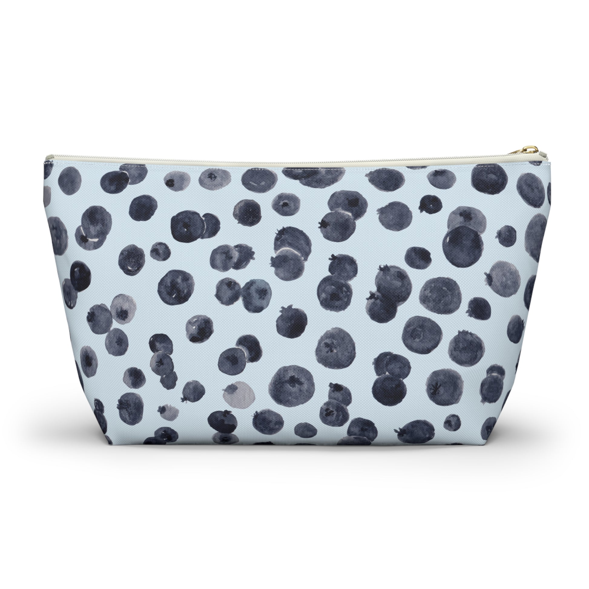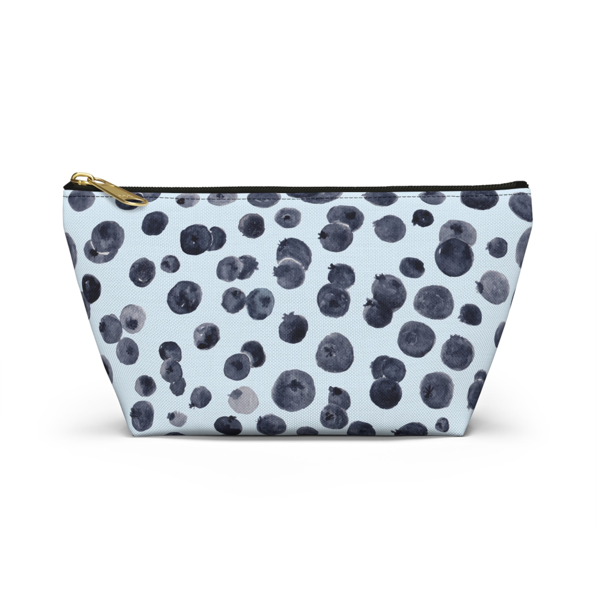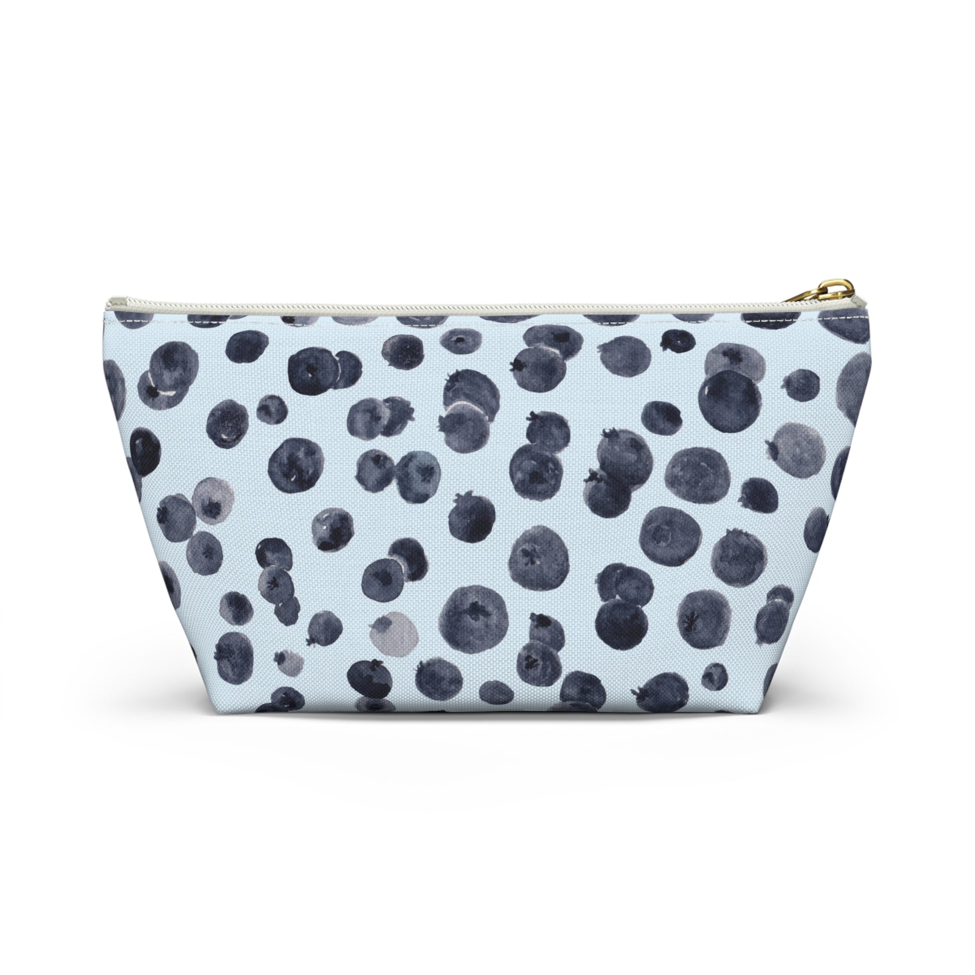 A lightweight accessory pouch with a sculpted T-bottom that sits upright on counters and in bags. The soft spun polyester holds the watercolor blueberries print in crisp, vibrant detail while resisting wrinkles so it looks fresh without ironing. A smooth gold-colored zipper pull opens to a laminated lining that protects contents and helps the pouch keep its shape. Carry it as a makeup bag, art-supply case, or everyday organizer — the playful, hand-painted blueberries add a calm, creative touch to morning routines and studio days.