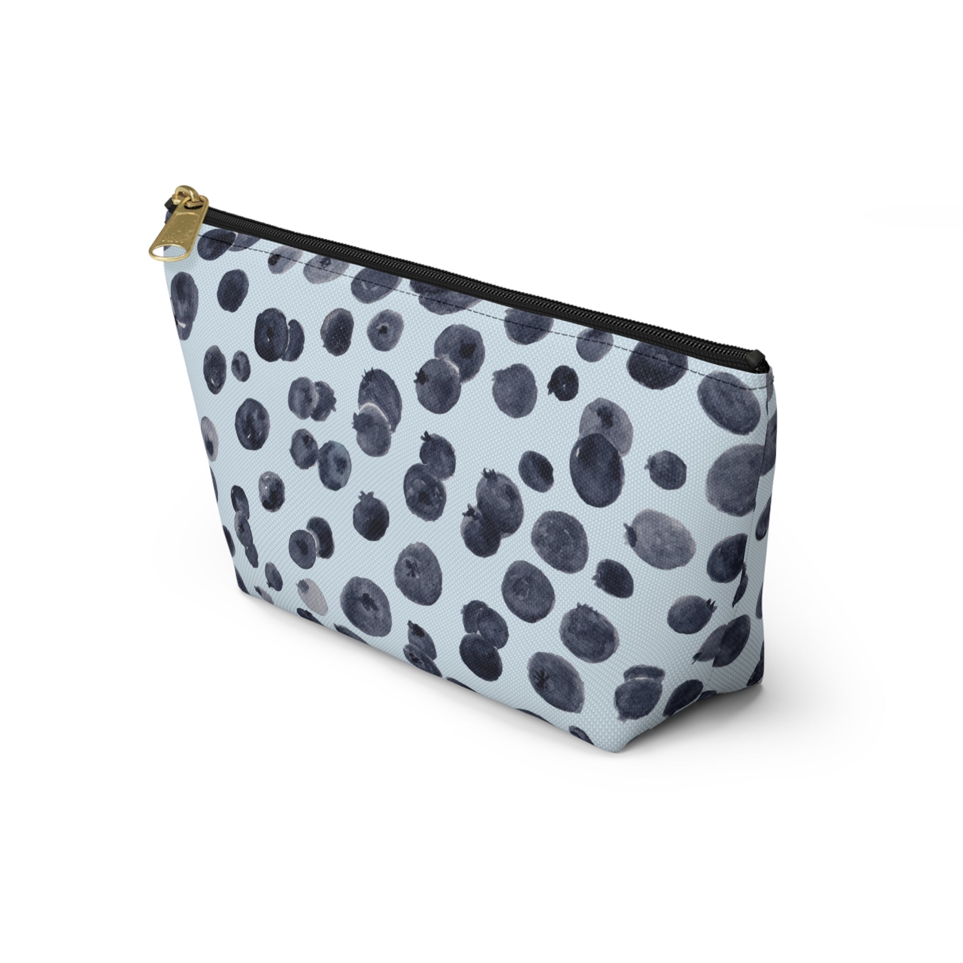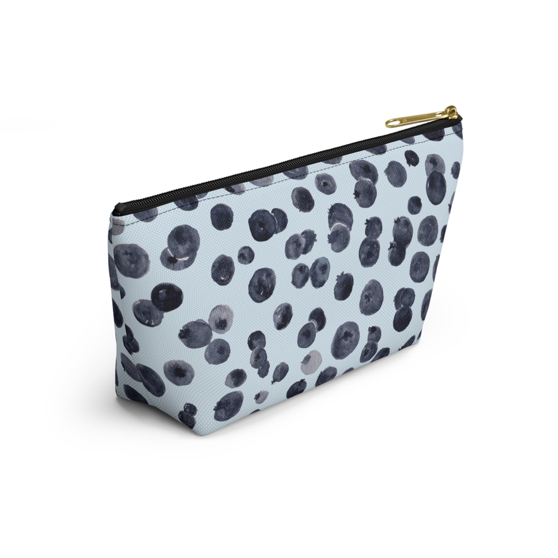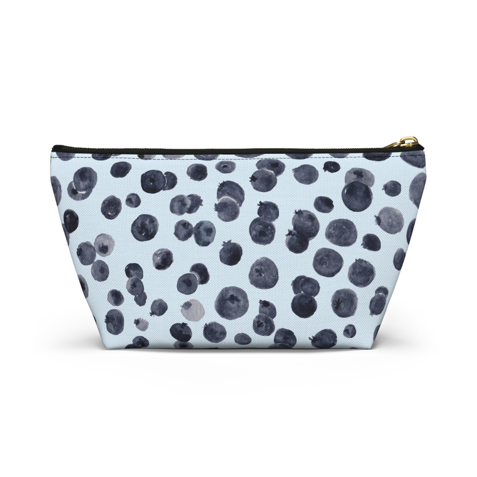 A lightweight accessory pouch with a sculpted T-bottom that sits upright on counters and in bags. The soft spun polyester holds the watercolor blueberries print in crisp, vibrant detail while resisting wrinkles so it looks fresh without ironing. A smooth gold-colored zipper pull opens to a laminated lining that protects contents and helps the pouch keep its shape. Carry it as a makeup bag, art-supply case, or everyday organizer — the playful, hand-painted blueberries add a calm, creative touch to morning routines and studio days.