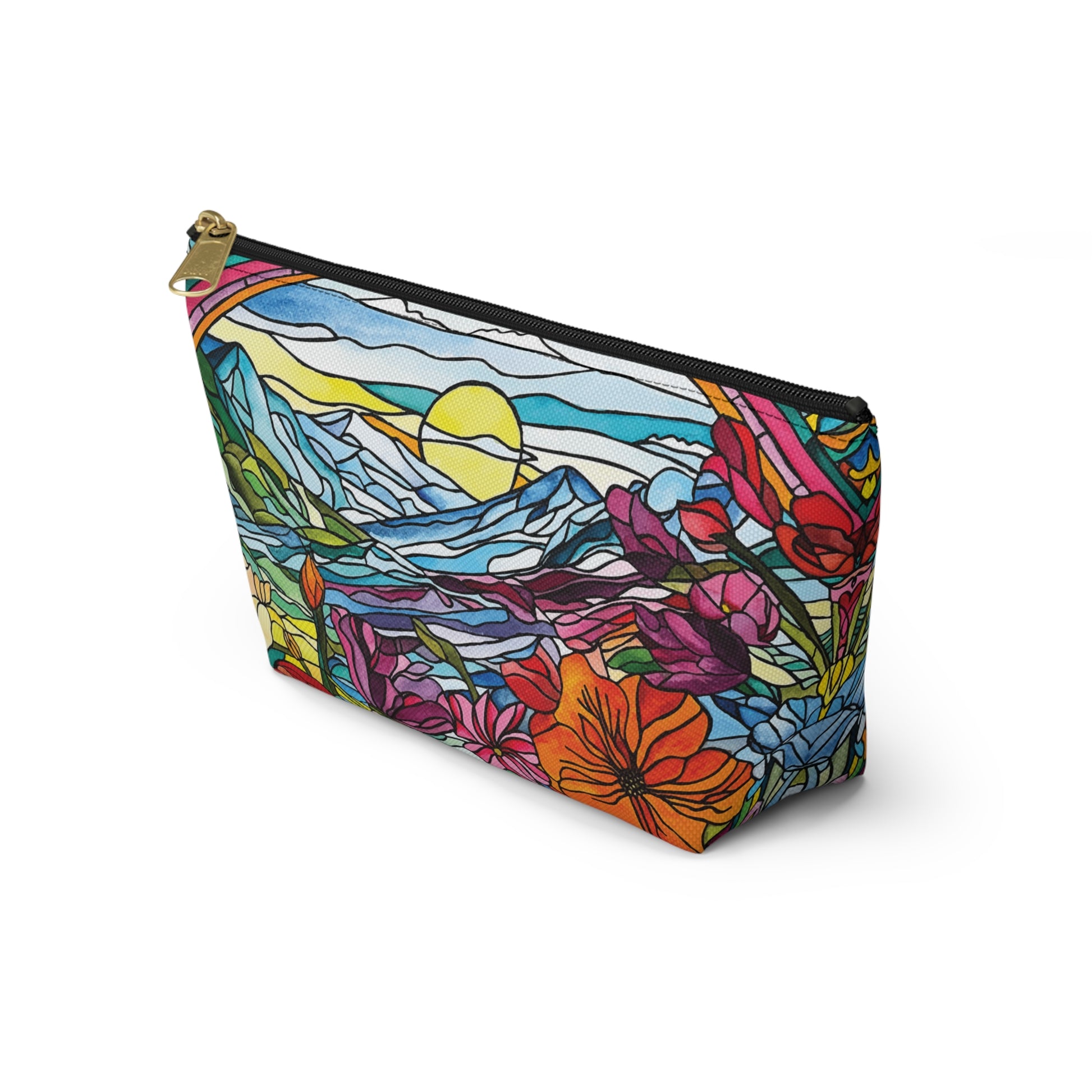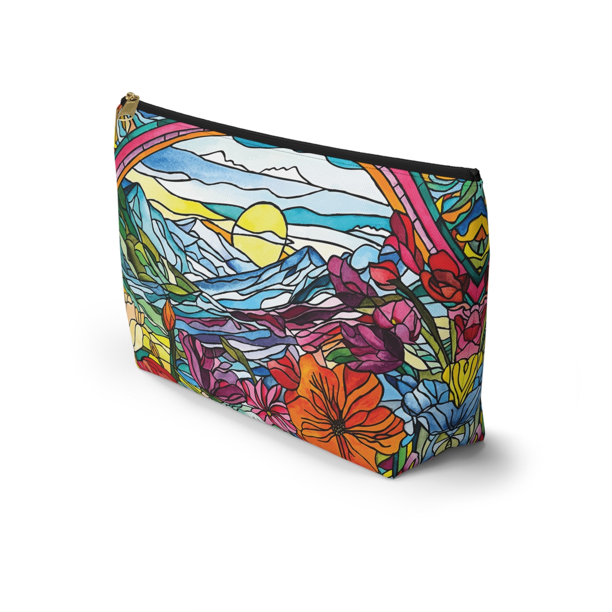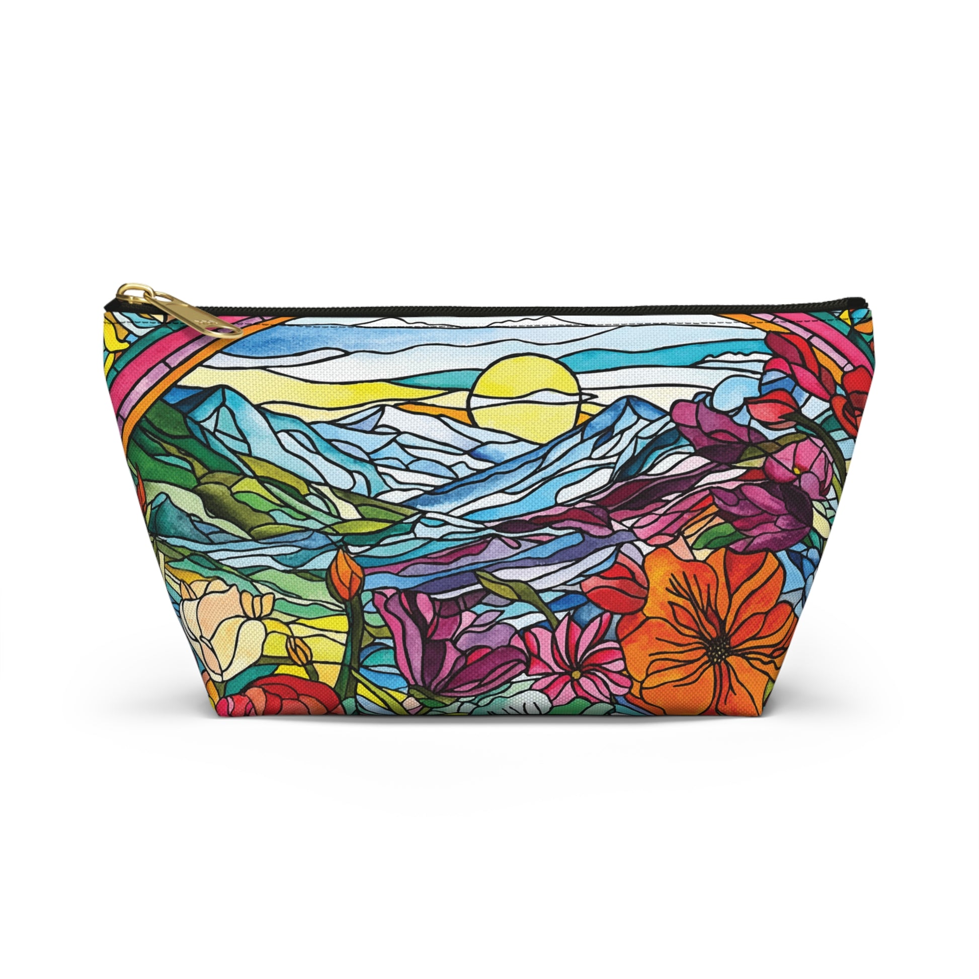 Bright, artful accessory pouch inspired by stained-glass landscapes. The scene unfolds in bold, jewel-like colors — mountains, sunrise, and a profusion of wildflowers — printed edge-to-edge on durable spun polyester that holds its shape and resists wrinkles. A smooth gold-tone zipper adds a touch of warmth while the laminated interior protects contents and keeps the design’s colors vivid. Slip it into a tote or carry solo to keep makeup, cords, or small travel essentials organized with a sunny, hand-painted feel.